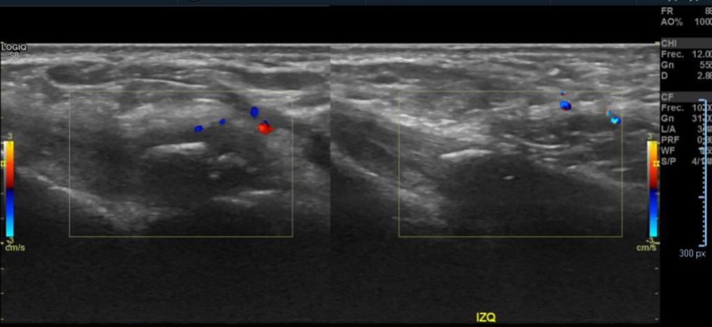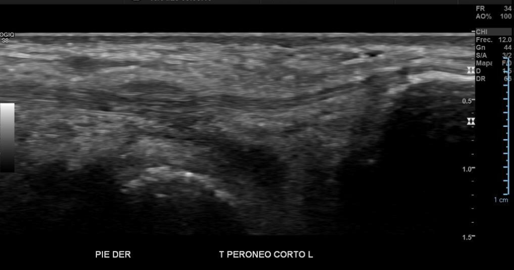 Engrosamiento y disminución de ecogenicidad del tendón peroneo largo en su región distal, sin desgarros.
