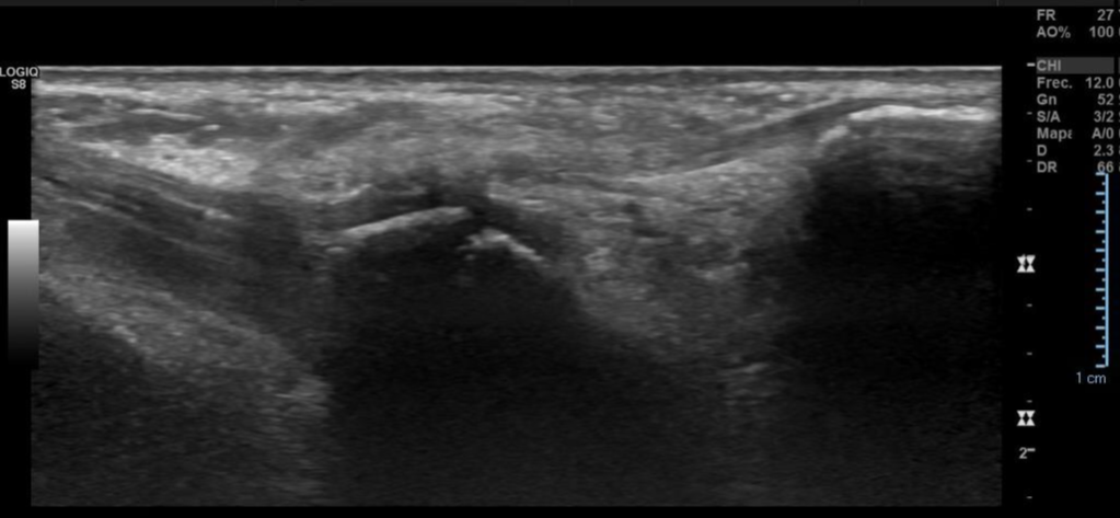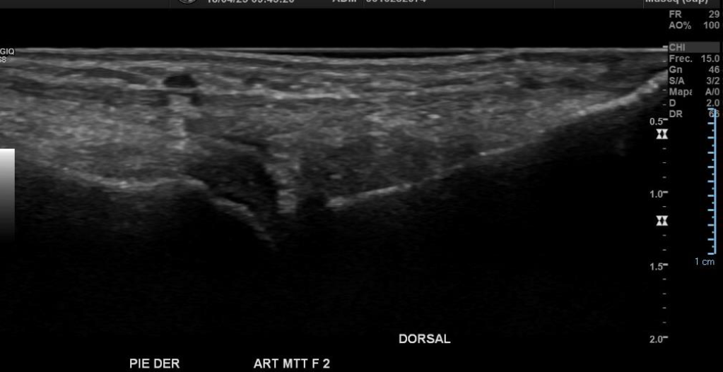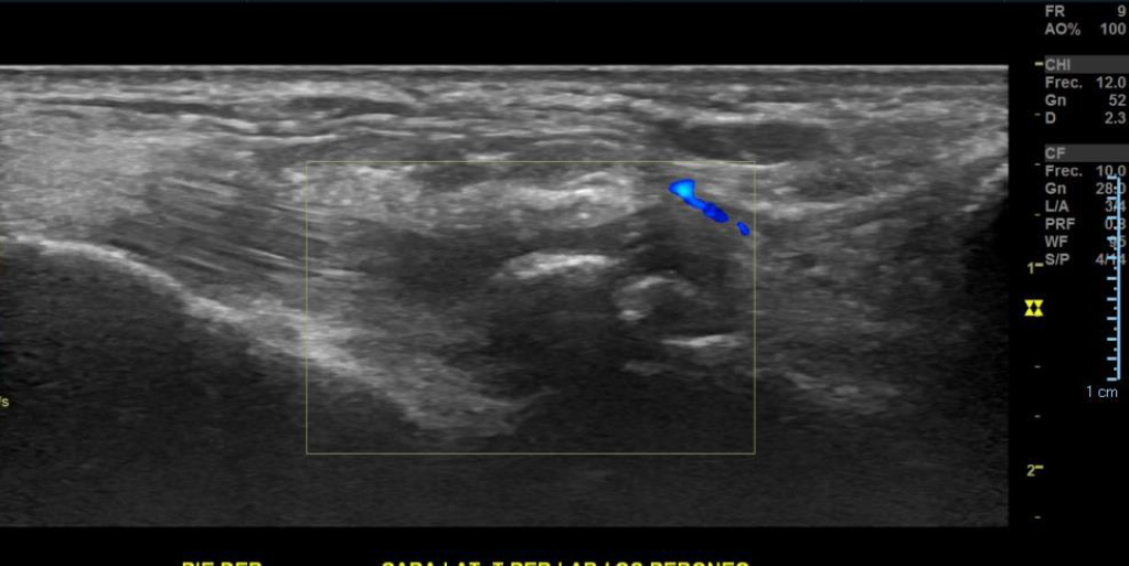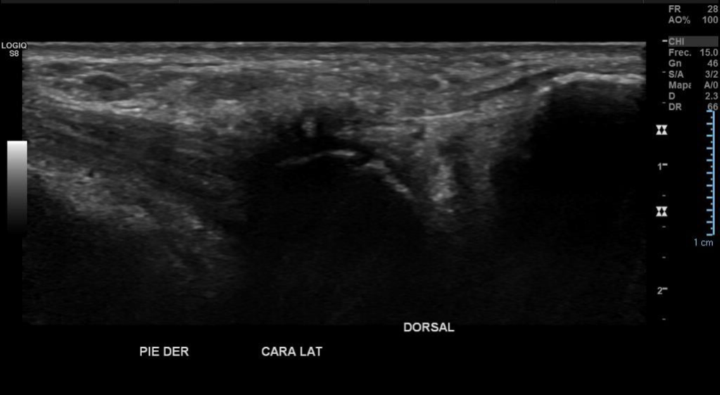 Impresión diagnóstica: Imagen con aspecto de os peroneo de contornos corticales irregulares, con cambios inflamatorios de las partes blandas adyacentes, pudiendo estar en relación a fractura a este nivel. Se sugiere evaluar con radiografía.