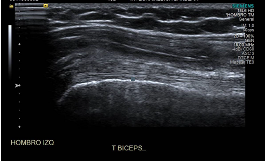 El tendón del biceps presenta patrón fibrilar y ecogenicidad conservada y se encuentra bien situado en la corredera bicipital, con distensión de su vaina y calcificaciones en relación a la vaina tendinea.