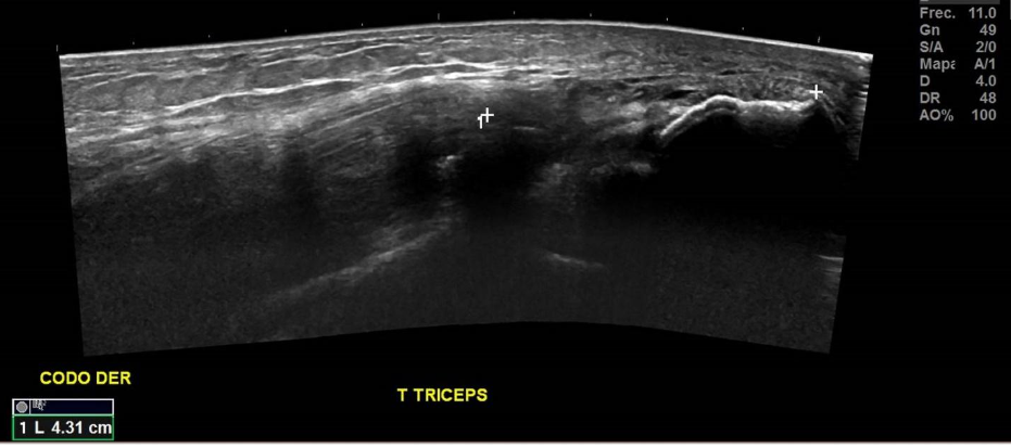 Hallazgos: Tendón tricipital no visualizado en el tercio distal, en el contexto de rotura completa, con gap de 43 mm y fragmento óseo avulsivo en su espesor en el tercio medio, mide 9 mm. Se identificaron extensos cambios inflamatorios a este nivel y aumento de señal al estudio Doppler Color.